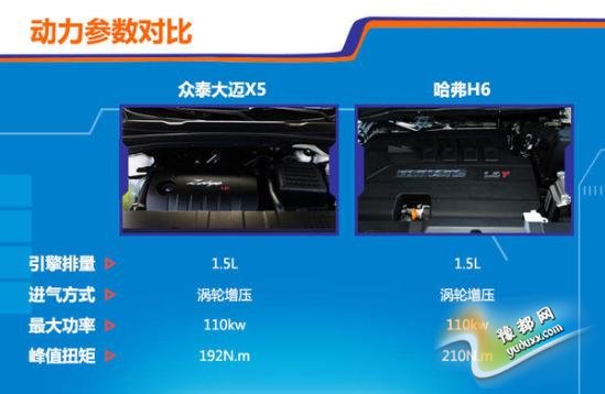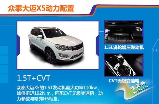 动力方面,众泰大迈X5搭载一款1.5T涡轮增压发动机,最大功率110kw,峰值扭矩达到了192N.m,这与该级别热销车型哈弗H6的动力参数相当。与这款发动机匹配的是一款CVT无级变速箱,众泰大迈X5并非定位一个硬派SUV,搭载CVT变速箱的初衷相比是为了提高该车的燃油经济性而设定。该动力总成也曾搭载于众泰Z500上,经过消费者的检验,在动力总成在驾驶表现以及油耗上都可圈可点。