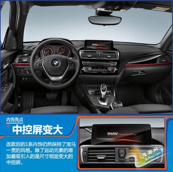 在车辆的内部,新款宝马1系内饰的整体造型保持了宝马家族式的设计风格,与现款车型如出一辙。整体偏向驾驶员一侧设计的中控台造型非常简洁,并集成了高分辨率的6.5英寸中央显示屏。标志性的DriverFocused座舱设计辅之以优质的材料,为新款1系带来了优质的乘坐感受。而三款不同的套件通过细节的区别,将为新车营造出不同的内饰气氛。此外,新车配备了全新的iDrive系统、主动巡航控制系统、发动机启停、自动泊车、宝马远程服务功能等先进的功能性配置。