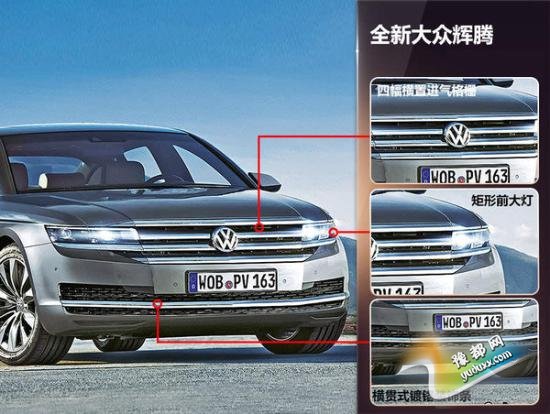 全新辉腾的外观设计借鉴了大众家族全新的设计理念,采用更多横向线条元素,使得其视觉效果较现款更加扁平。新车的进气格栅采用四横幅镀铬条设计,而前大灯的尺寸较现款小了一些,与进气格栅上面三条镀铬条融为一体,商务气息更浓。镶嵌在保险杠上的下进气口为一体化设计,设置有横贯进气口的镀铬装饰条。