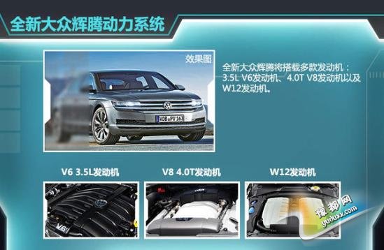 全新一代辉腾将由MLB Evo平台研发,该平台产品的车身结构采用更多铝制材料与其他轻量化材料,全新辉腾的整车质量将大幅度下降,较现款减重超过200公斤。同时,全新车型将推出加长轴距版本。据悉,在动力上辉腾将搭载3.5L V6发动机以及V8双涡轮增压发动机,顶配车型有望搭载W12发动机并配备quattro四驱系统,此外还有望推出混合动力车型。