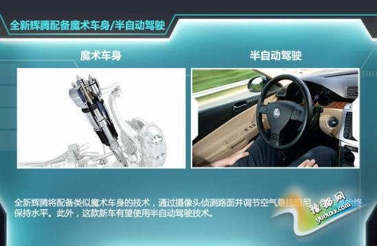 这款全新辉腾将更加注重驾乘的舒适性,有望配备类似全新奔驰S级“魔术车身”的装备。该装置通过摄像头与传感器侦测路面的情况,配合空气悬架并调节减震器阻尼以保证在颠簸路面车身始终保持水平状态,最大程度增强车身舒适性。科技配置上,新一代辉腾有望装备半自动驾驶技术。(网通社 2015年4月17日 北京报道)