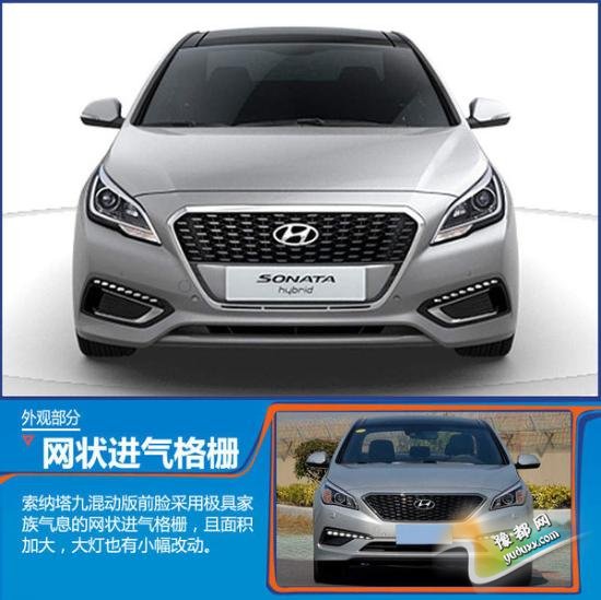 索纳塔九混动版采用现代汽车最新的“流体雕塑2.0”设计语言,LED大灯组造型犀利,大灯周围加以镀铬饰条修饰,横幅式镀铬进气格栅大幅提升新车运动感。并且前进气格栅和车牌悬挂处融为一体,与索纳塔九有所不同。