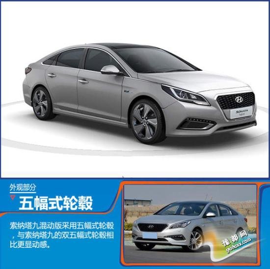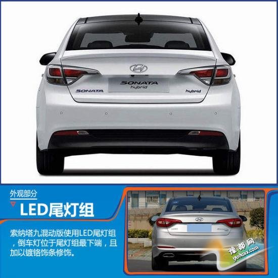 新车侧身腰线平滑、流畅,全新五幅式轮毂采用了低风阻设计,并且造型更显动感。索纳塔九混动版LED尾灯组有所变化,刹车灯下移,作为一款混合动力车型,代表其身份的“Hybrid”标识自然必不可少,位于新车尾部右下方。