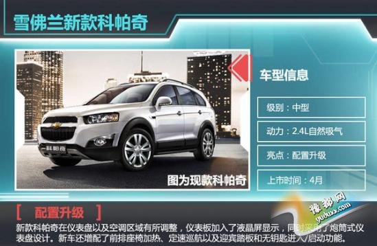 雪佛兰旗下的中型SUV——科帕奇有望在4月份推出全新改款车型。根据此前媒体曝光的谍照看,新车现款车型相比,外观有所调整更加豪华大气,配置上也有所升级。新款科帕奇在仪表盘以及空调区域有所调整,仪表板加入了液晶屏显示,同时采用了炮筒式仪表盘设计。新车还增配了前排座椅加热、定速巡航以及迎宾踏板和无钥匙进入/启动功能。 动力方面,新车将依旧搭载2.4L发动机。