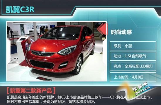 凯翼是奇瑞去年推出的新品牌,继C3上市后该品牌第二款车——C3R将在4月8日正式上市,届时将推出三款车型,分别为蓝钻版、黄钻版和金钻版。凯翼C3R采用奇瑞E2平台打造,长宽高分别为3972mm/1726mm/1510mm,轴距为2510mm。该车拥有较为丰富的配置,全系标配LED后尾灯、倒车雷达、四门电动车窗、中控锁和USB接口等。顶配车型还将配备倒车影像、7英寸液晶屏、导航、车载蓝牙、多功能方向盘和定速巡航等配置。