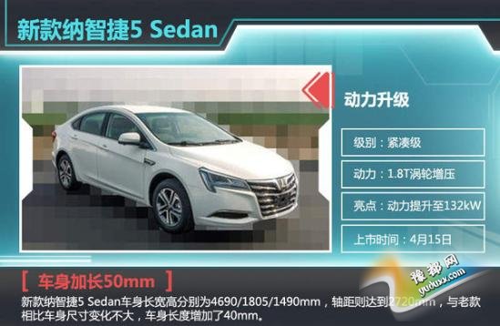 之前,我们曾曝光了东风裕隆旗下新款纳智捷5 Sedan的谍照,新车将在4月15日正式上市,推出四款车型,售价区间预计在10-14万元。新款纳智捷5 Sedan车身长宽高分别为4690/1805/1490mm,轴距则达到2720mm,与老款相比车身尺寸变化不大,车身长度增加了40mm。