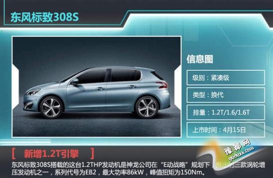 东风标致于去年底的广州车展上正式首发了旗下紧凑级两厢轿车308S,新车保留了海外308的全部设计。近日,网通社从东风标致官方获悉:308S将于4月15日正式上市,预售价格11.5万元起。对此,网通社在走访北京多家4S店后了解到,目前新车已经到店且全面接受预定,定金为5千元。新车将搭载三种排量的引擎,分别为1.2T、1.6T涡轮增压发动机和1.6CVVT自然吸气发动机,其中1.2T涡轮增压发动机则是东风标致首次将其应用量产车型上,最大功率86kW,峰值扭矩为150Nm。