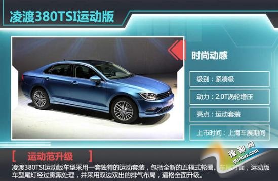 上海大众凌渡已经在今年1月份上市,上汽大众凌渡已经在1月正式上市,新车初期推出三款动力共7款车型,售14.59-21.39万。网通社近日从上海大众内部人士处获悉:广州车展期间上海大众将推出推出凌渡380TSI运动版车型。凌渡380TSI运动版车型将有一套独特的运动套装,车型尾灯经过熏黑处理,并采用双边双出的排气布局,力量感十足。