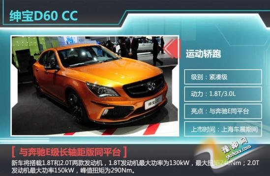 2015上海车展期间,绅宝将推出两款新车型,分别为D60 CC和D80。D60 CC基于绅宝D60普通版车型改进而来。新车外观方面与D60普通版车型区别不大,前保险杠两侧的进气口尺寸更为霸气,采用了蜂窝状的进气格栅,视觉冲击力更强,经过调整之后整体设计更加运动年轻。据悉,D60 CC该车与奔驰E级长轴距版车型同平台打造。动力方面,这款车或将搭载的是1.8T和3.0L发动机,传动方面与之匹配的是7速自动变速箱。