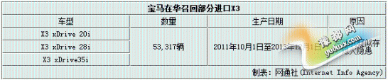 根据质检总局公布的消息,此次召回车型为宝马X3,具体型号为进口X3 xDrive 20i、X3 xDrive 28i和X3 xDrive35i。上述车型生产日期是2011年10月1日至2013年12月1日,共计53,317辆车涉及。