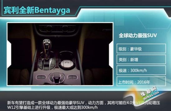 新车有望打造成一款全球动力最强劲豪华SUV,其基于第二代Q7平台打造,动力方面,其将可能在4.0升V8双涡轮增压W12引擎基础上进行升级,极速最大或达到300km/h。另外,宾利于明年或将推出一款插电混动版车型,纯电动模式下续航里程达48km。(网通社 2015年5月8日 北京报道)