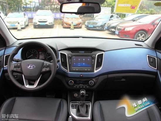 ix25的中控台布局清晰,仪表台表面为硬质塑料材质,并没有使用软性的搪塑工艺材质,但对于这个级别来说也无可厚非。三幅式真皮多功能方向盘采用了镂空设计,造型时尚。在各个出风口和方向盘下方恰到好处的镶嵌了银色饰条活跃了车内的气氛, 中控各个按键旋钮的阻尼也都能够提供不错的回馈质感。