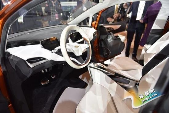 内饰方面:雪佛兰BoltEV概念车内饰配色采用了黑白的搭配,中控布局十分简洁。新车配备了两块液晶屏,将显示行车数据和多媒体信息等。
