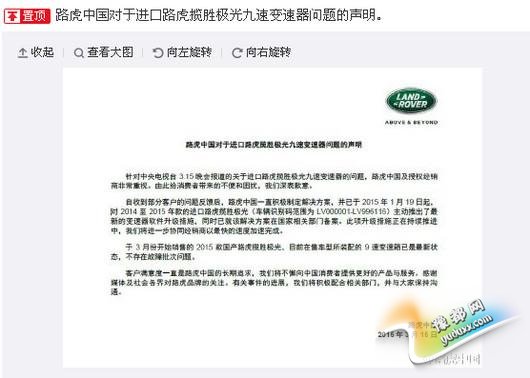 路虎方面表示,今年3月开始销售的2015款国产揽胜极光所装配的9速变速箱已是最新状态,不存在故障批次问题。