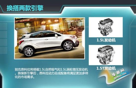 别克昂科拉是通用汽车旗下一款小型SUV,现款车型搭载1.4T发动机,2014年全年销量达到8.23万辆。通用汽车去年发布了全新一代小排量动力引擎并实施普及规划,通用汽车全球动力总成工程副总裁Steve Kiefer表示,通用汽车全新一代小排量引擎将应用到通用汽车旗下5大品牌的27款车型上。近日,网通社查询环保目录获悉,别克昂科拉将搭载1.5L自然吸气和1.5L涡轮增压发动机。换装新引擎后,昂科拉将继续与福特翼搏等同级车型相竞争。