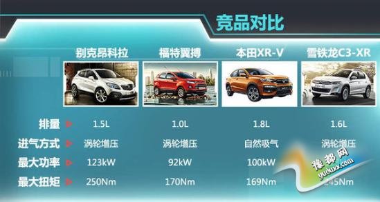 近年来国内小型SUV市场持续火热,众多车企纷纷推出相应车型抢占市场。福特翼搏、本田XR-V、雪铁龙C3-XR都是同级别中具有竞争力的车型,其中福特翼搏2014年销量为8.46万辆,稍稍领先昂科拉的8.23万辆。值得一提的是,福特翼搏、雪铁龙C3-XR等车型均配备两款发动机可覆盖更加宽泛的市场范围,换装两款引擎的昂科拉也将更加适应市场竞争。