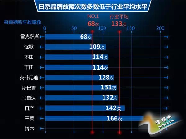 日系车型一直以来以油耗与舒适著称,然而在汽车安全可靠性问题上也没有丝毫懈怠,普通品牌如此,豪华品牌更是如此。据统计,2014年每百辆车故障的行业平均次数为133次,网通社查阅相关资料后发现:雷克萨斯、讴歌以及英菲尼迪三大日系豪华品牌,在质量可靠性方面均取得不错的表现,其中雷克萨斯连续三年保持第一,而英菲尼迪和讴歌的排名也分别上升10位和4位。不过这日系三大豪华品牌全部跻身前十,但是他们之间的故障率差别也比较明显,其中英菲尼迪与雷克萨斯相比故障率高出近1倍。