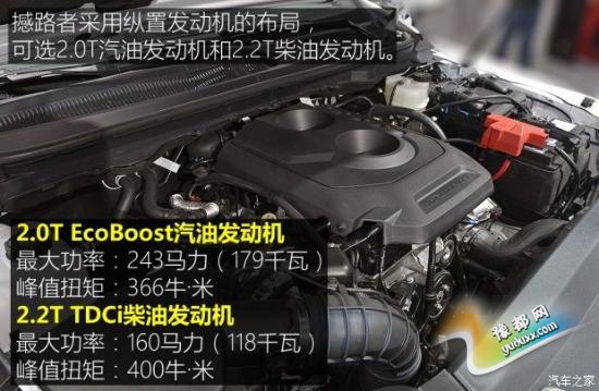 动力方面,福特撼路者将搭载2.0L EcoBoost汽油发动机和2.2L DuratorqTDCi四缸柴油发动机。前者最大功率243马力,峰值扭矩366牛·米;柴油机的最大功率为160马力,峰值扭矩能达到400牛·米。传动方面,汽油发动机匹配的是6速手自一体变速箱;柴油发动机匹配的是6速手动或6速手自一体变速箱。