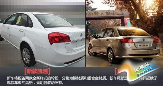 新款凯越整体外观设计相比老款车型变化不大,在一些细节上有所改动。新车在前保险杠中取消了雾灯框的设计,并将提供LED日间行车灯可选。此外新车标志性直瀑镀铬中网,大灯光源布局等设计无明显变化。新车将配备两款全新样式的轮毂,分别为钢材质和铝合金材质。新车尾部造型设计同样延续了现款车型的风格,无明显改动细节。