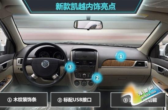 在内饰方面,新款凯越沿袭了现款车型的设计,车内使用了木纹和镀铬饰条装饰,在视觉上增加了一些高档感。新车座椅材质采用了双拼工艺,在肩部进行了材料的强化,并针对主要接触面采用了打孔真皮的材质。新车配备了驾驶员车窗一键升降功能,增加的蓝牙连接系统可实现电话接听及音乐播放功能,USB接口升级为全系标配,新车的空调系统还将采用可过滤PM2.5的滤网材料。