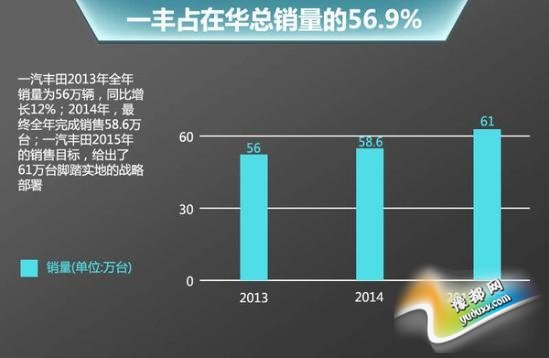 2014年,丰田在中国市场的总销量首次超过100万辆,达103万台,其中一汽丰田最终全年完成销售58.6万台,占丰田在华累计销量的56.9%。作为丰田在华的主力军,超过半数的占比足以凸显其重要性。在取得良好成绩之外,一汽丰田总经理平野雅则先生表示:“一汽丰田还会提升销售和服务等营销品质,并将与TMCI一同强化丰田在中国的品牌发展。”2015年,一汽丰田将推出全新皇冠、卡罗拉混动车型及一汽丰田渠道销售的进口2.7L普拉多等多款新车型促进销量增长。