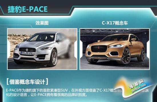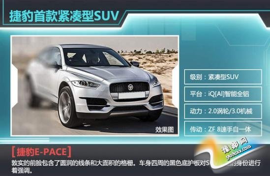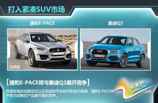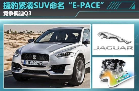 捷豹在不久前发布的官方消息表明,该品牌将在2016年推出定位为跑车型运动SUV的捷豹F-PACE。这款车型的公布,预示着捷豹品牌正式进军豪华SUV领域。近日,德国媒体autobild报道称:捷豹将推首款紧凑型SUV,与时下热门的奥迪Q3等车型展开激烈竞争。网通社从国家工商总局了解到,捷豹路虎有限公司注册了E-PACE、F-PACE等全新商标。这表明除F-PACE外,捷豹还将推出一款命名为“E-PACE”的全新车型。根据捷豹目前的命名习惯,E-PACE即为定位略低于F-PACE的紧凑型SUV。