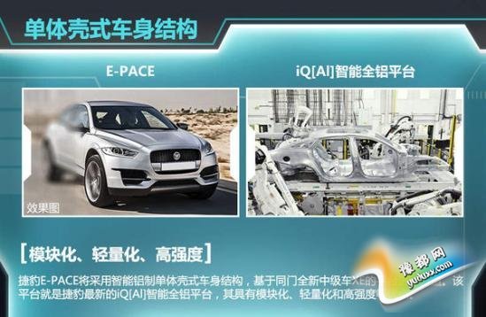 除了外观上的品牌特质,捷豹E-PACE将采用智能铝制单体壳式车身结构,基于同门全新中级车XE的平台进行打造。该平台就是捷豹最新的iQ[Al]智能全铝平台,其具有模块化、轻量化和高强度等优点。相比目前捷豹XJ等车型使用的全铝车身,模块化全铝架构使用更高密度的全铝材质。捷豹技术专家Mark White博士表示:“这意味着超轻车身重量、高强度和抗扭性能。”另外,此平台的双叉臂前悬、电动转向等技术的应用,也将使捷豹E-PACE更适用于公路驾驶。
