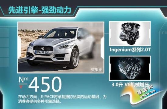 在动力方面,E-PACE将承载捷豹品牌的运动基因,提供多种引擎选择。其中捷豹最新研发的Ingenium系列2.0T四缸发动机的摩擦系数较此前捷豹车型所搭载来自福特的2.0T引擎大幅降低,在同类别中称得上是最为高效的2.0T引擎。更强动力的车型上有望采用源于捷豹F-TYPE的3.0升 V6机械增压引擎,最大功率为250kW,峰值扭矩450Nm。传动方面,新车将搭载ZF 8速手自一体变速箱。