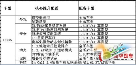 同时,2015款CS35还配备了全新的in Call 2.0智能车载互联系统,该系统具备车互联、行车辅助、生活服务、娱乐资讯和安全防护5大核心功能,不仅可以通过系统与手机蓝牙连接,拨打和接听电话,还可以通过手机或其他wifi无线热点连接,随时查看新闻、体育、娱乐资讯,及时了解你热衷的各种资讯。更可通过4GB内置存储空间和外接U盘和SD卡设备,播放电影、音乐和图片信息。此外,CS35自动挡车型还增加运动模式选择。