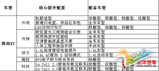 此次上市的2015款致尚XT售价为7.79万元至11.99万元。2015款致尚XT在原有车型基础上增加了1.6L手动锐酷型以及1.6L自动锐酷型车型,这两款车型的加入,将成为致尚XT 1.6L手动与自动的顶配车型。