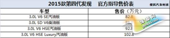日前,搜狐汽车获悉,2015款第四代发现车型正式上市,新车售价区间为82.8万元-102.8万元。详细售价请见下表: