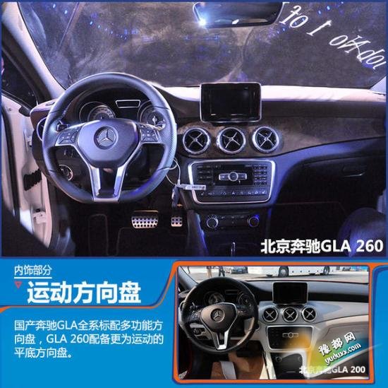 内饰方面,国产GLA的内饰布局与进口车型无异,风格偏向年轻运动,喷气式的空调出风口、三幅式方向盘以及悬浮式的大屏幕无一不透着运动气息。1.6T与2.0T车型均采用多功能方向盘,但是2.0T车型方向盘使用运动气息更浓的平底设计。