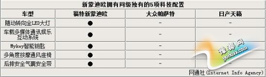 为了让大家了解新蒙迪的科技含金量我们将它与同级别热销的车型作比较。在将新蒙迪欧与竞争对手大众帕萨特、日产天籁等车型做对比后发现,新蒙迪欧拥有多项同级领先的配置。除了随动转向全LED大灯外,车载多媒体通讯娱乐互动系统、Mykey智能钥匙、多角度按摩通风座椅、后排安全气囊安全带,这五大同级别中独有的科技配置,加上价格优势形成了新蒙迪欧高性价比的核心竞争力。