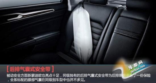 安全配置已成为厂商吸引消费者的重点。新蒙迪欧搭载了后排气囊式安全带,当车辆在发生碰撞时气囊式安全带迅速膨胀,增大与乘客身体的接触面积,有效地保障后排乘客避免安全带束缚所造成的二次伤害。在同级车型中,仅新蒙迪欧配备了后排气囊式安全带。除后排气囊式安全带外,新蒙迪欧还全系标配了膝部安全气囊,为驾乘人员带来全方位保护,这项配置在同级别车型中也并不多见。