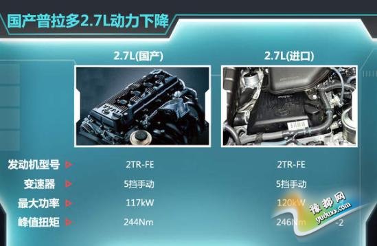 由于普拉多2.7L国产与进口车型车身尺寸并未发生变化,因此就不再赘述。在动力上,国产普拉多2.7L搭载的是型号为2TR-FE的发动机,与进口车型发动机型号保持一致,不过排放标准由进口发动机的欧Ⅳ调整为国Ⅳ(国Ⅴ),因此发动机输出功率相应打了一些折扣,但影响并不算明显,最大输出功率降低了3kW,最大扭矩则相应下降2Nm。值得一提的是,一汽丰田官方并未公布该车的油耗值,但由于国产普拉多2.7L入门车型-手动版相对进口车型车身重量减轻40kg,因此该车百公里综合油耗也有望下探。
