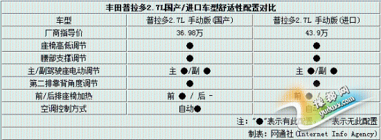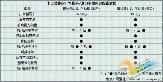 首先从外部配置上来看,国产普拉多2.7L 手动版与进口手动版相比略处下风,电动天窗、后视镜电动调等配置应有尽有,但少了1项进口车型所具备防紫外线/隔热玻璃;在内部配置上,国产车型表现与进口车型同样出色,均配备了真皮多功能方向盘以及真皮座椅等等。