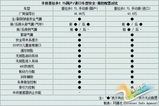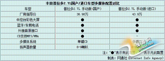 与前几大项配置相差无几相类似,国产普拉多2.7L 手动版与进口手动版在多媒体以及舒适性配置上并没有明显区别,但前者稍占优势,国产普拉多2.7L 手动版不仅配备了座椅高低调节、腰部支撑调节以及主/副驾驶座电动调节以及第二排靠背角度调节等多项实用配置,同时还具有CD支持MP3/WMA一项,这在很大程度上为驾驶员在越野过程中起到放松的作用。