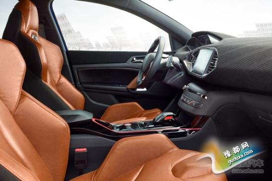 内饰方面: 标致308R Hybird概念车采用了极简的设计风格,中控台采用了全新材质进行包裹,档把的样式也进行了全新的设计并配以红色装饰条点缀。另外,新车还采用了真皮包裹的桶型座椅。
