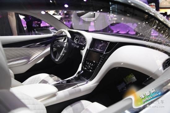 内饰方面:Q60概念车内饰采用了环抱式设计,并使用白色皮革和碳纤维材质进行包裹点缀,极具豪华感与运动感。中控台还配备了两块液晶显示屏,内部还采用2+2座椅布局。另外,新车将采用电子手刹,并配备可切换驾驶模式的旋钮设计。