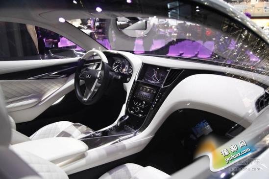 内饰方面:Q60概念车内饰采用了环抱式设计,并使用白色皮革和碳纤维材质进行包裹点缀,极具豪华感与运动感。中控台还配备了两块液晶显示屏,内部还采用2+2座椅布局。另外,新车将采用电子手刹,并配备可切换驾驶模式的旋钮设计。