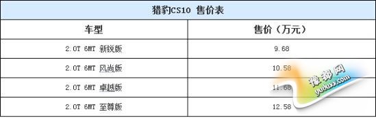 [搜狐汽车2015上海车展]在2015上海车展上,猎豹旗下全新紧凑型SUV——CS10正式上市,售价区间为9.68-12.58万元。