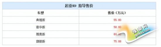 [搜狐汽车新车] 4月20日,在上海车展媒体日,起亚K9正式上市,售价为:55.8万-75.88万元。其中包括4款车型,典雅版55.80万元,豪华版58.80万元,尊贵版69.80万元,旗舰版75.88万元。