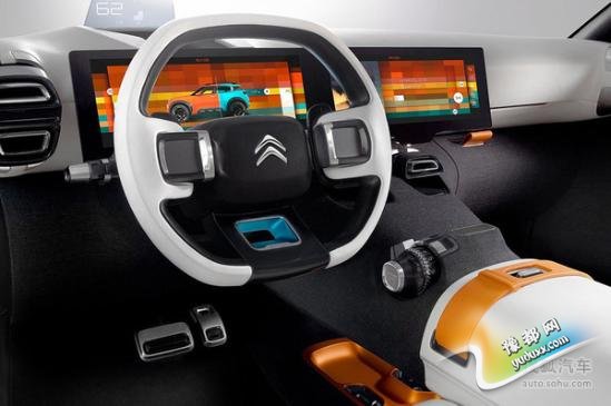 雪铁龙AirCross概念车的内饰设计与外观相比给人更眼前一亮的感觉,独特的三辐式多功能方向盘两侧带有手写功能,仪表盘与中控台上方均配备大尺寸液晶显示屏,前部还带有HUD抬头显示系统。另外,新车座椅的样式更像是移动型沙发,提供足够包裹性的同时,也不缺乏舒适性。