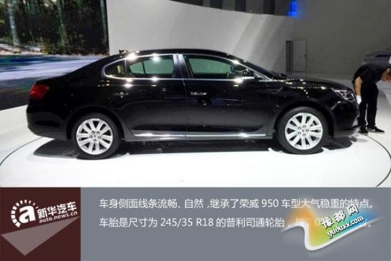 车身侧面线条流畅、自然,继承了荣威950车型大气稳重的特点。车胎是尺寸为245/35 R18的普利司通轮胎,与2.0T车型一致。