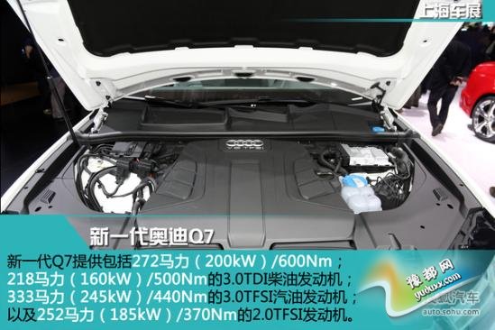 奥迪新一代Q7提供多种选择,包括可以输出272马力(200kW)/600Nm;218马力(160kW)/500Nm的3.0TDI柴油发动机;可以输出333马力(245kW)/440Nm的3.0TFSI汽油发动机;以及一款小排量的2.0TFSI发动机,其最大功率和扭矩分别为252马力(185kW)和370Nm,据了解,这款配备2.0TFSI发动机的Q7将主要提供给亚洲市场。