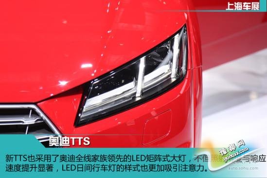 奥迪全新TTS镀铬前中网和下前唇都彰显着S系列车型独特的运动气质。而六边形的中网则让TTS的前脸更加硬朗。新TTS也采用了奥迪全线家族领先的LED矩阵式大灯,不但照射角度与响应速度提升显著,LED日间行车灯的样式也更加吸引注意力。